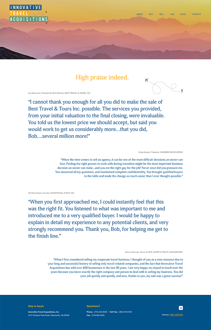 “You took my company to a whole new level!! The quality and number of leads has skyrocketed. Our reach is worldwide now since you redesigned and upgraded our website. I receive verbal compliments constantly from people who visit our site. Vanessa, I cannot thank you enough for the great job you did for my firm.”